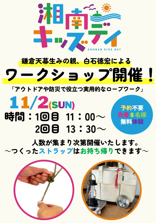 イベント2日目には、鎌倉天幕生みの親、白石徳宏による「防災に役立つロープワークショップ」を行います!
